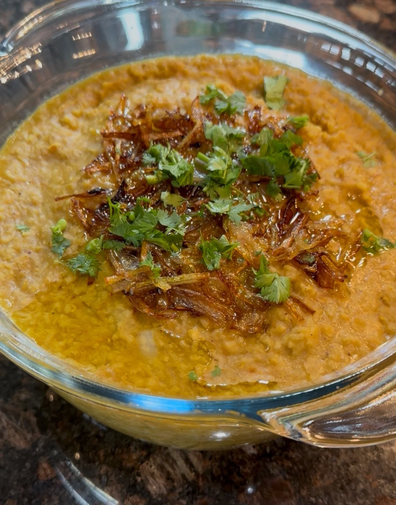 Wash and drain rice and daal. Add all the ingredients above in a pot. Cook on medium heat until rice and daal are mushy. Khichari should be the consistency of porridge when done. Add more water as needed. Garnish with browned onion and the oil it was browned in, and cilantro as desired. Gram masala may be sprinkled on top. Serve by itself. Plain yogurt goes well with it. (Serves 4 or 5)
